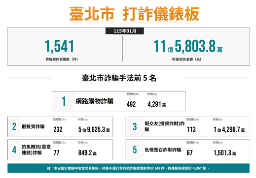 二、經分析本市115年1月各類詐欺案件發生數共計1,541件,財 損金額新臺幣(以下同)11億5,803.8萬元,前3大高發詐 欺手法受理件數及財損金額: