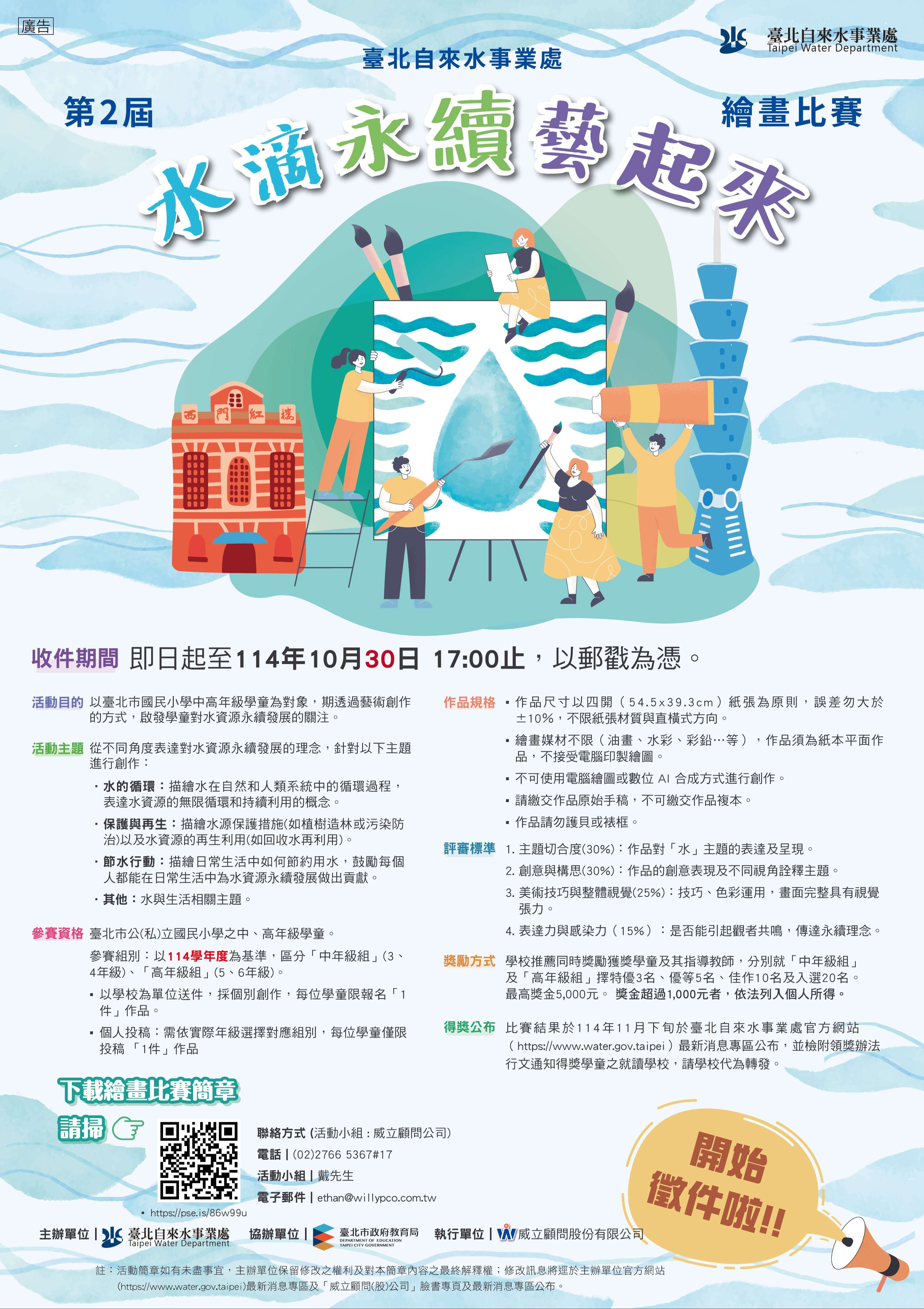 一、臺北自來水事業處委託辦理旨揭比賽(即日起至 114年9月30日止),藉由繪畫創作引導學童深入認識水資 源永續利用與節約用水的重要性,並鼓勵教師將水資源教 育融入課程,啟發學童以藝術方式展現創意與環保理念。