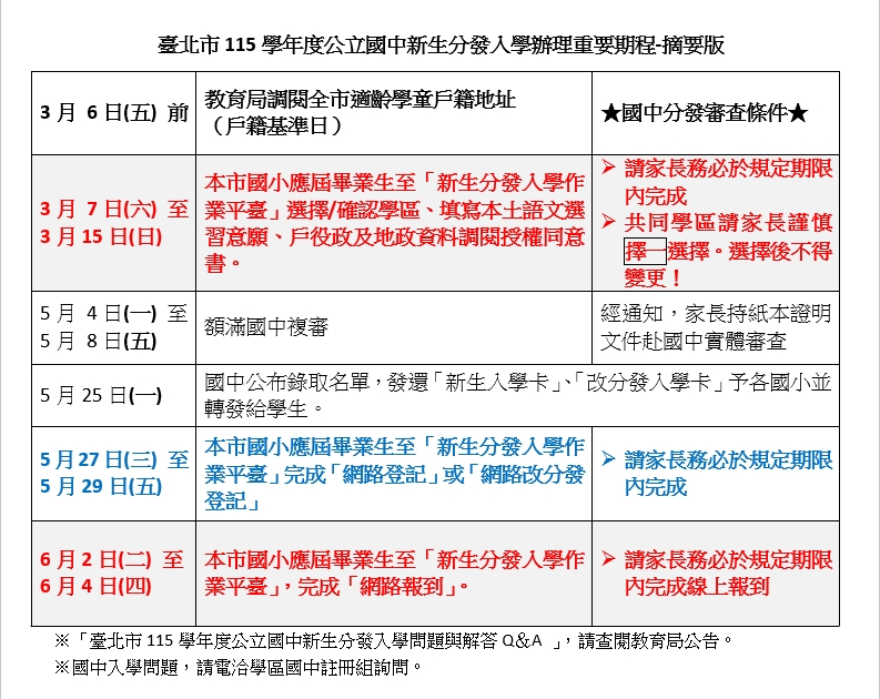 為保障孩子就學權益,請務必詳閱台北市政府教育局公告並配合期程辦理。如有疑問,請洽詢設籍學區公立國中註冊組,以免耽誤國中分發。